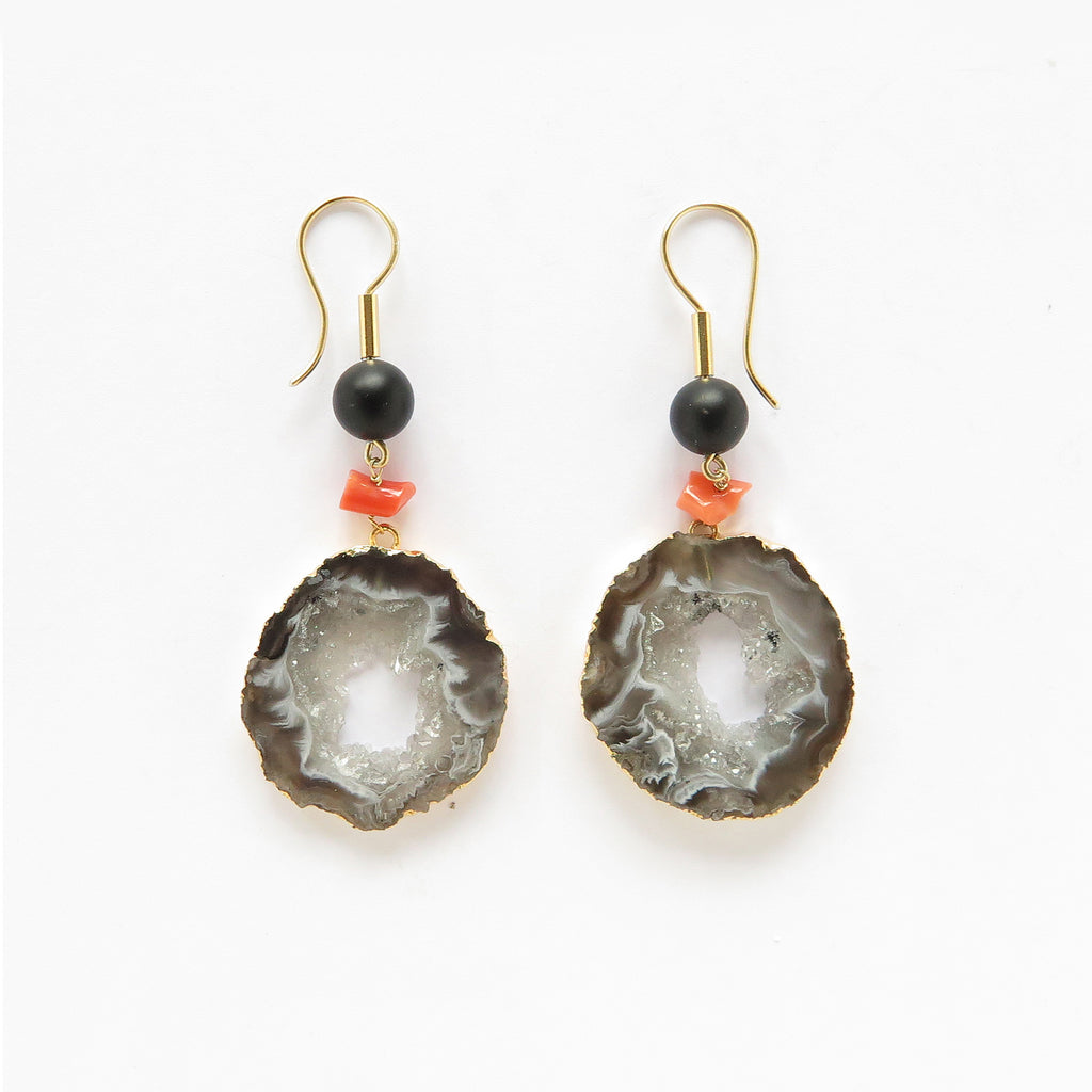 Black agate beads, red coral & black magma geodes with miniature quartz crystals on the inside.