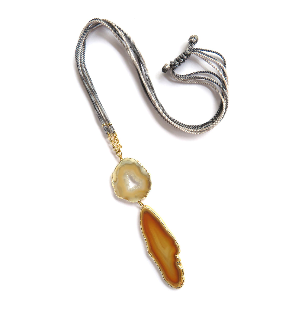 A necklace resembling a Native American dreamcatcher with a web and a hanging feather.