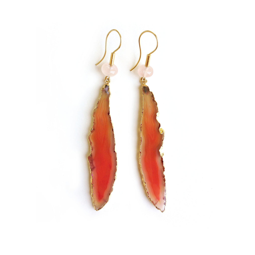 Sutil combinación de fuego y suavidad. Un par de ágatas de forma única combinado con cuarzo rosa facetado a mano.