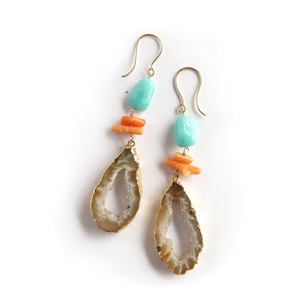 Amazonita y coral combinados con geodos de agata en forma de gota.